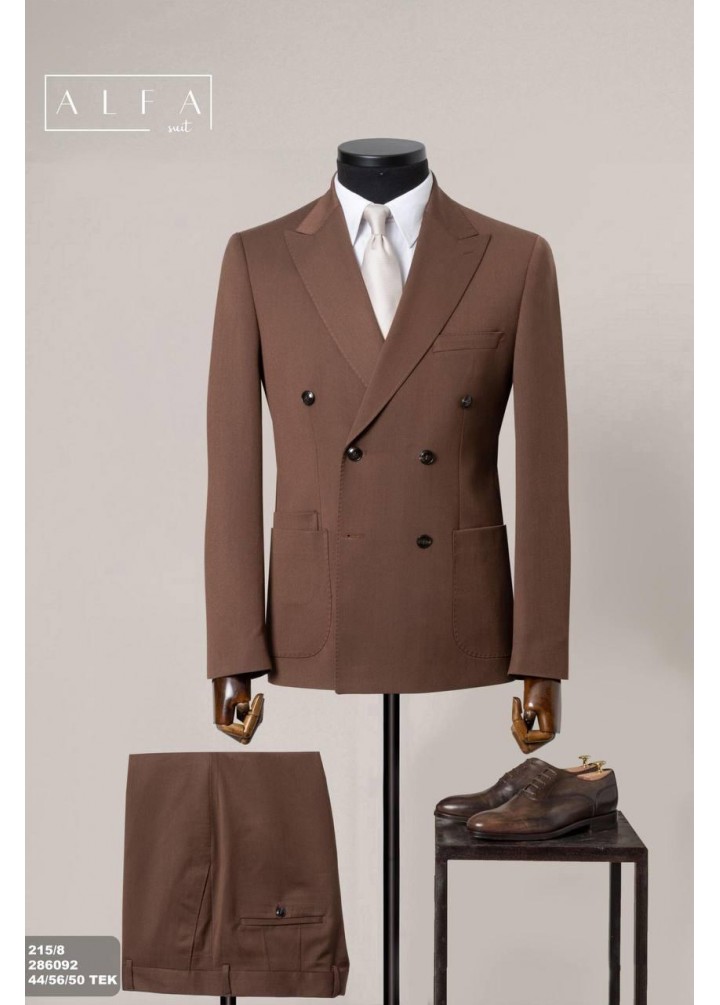 Güçlü ve zarif bir stil için tasarlanan bu kruvaze kahverengi takım elbise, %70 poliviskon ve %30 pamuk karışımı özel kumaşıyla hem şıklığı hem de konforu bir araya getirir.